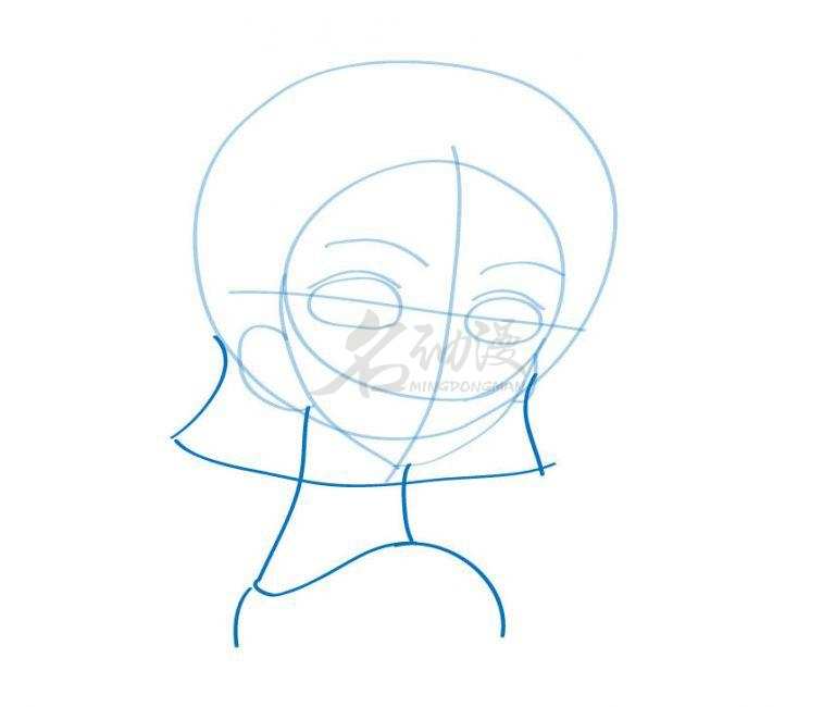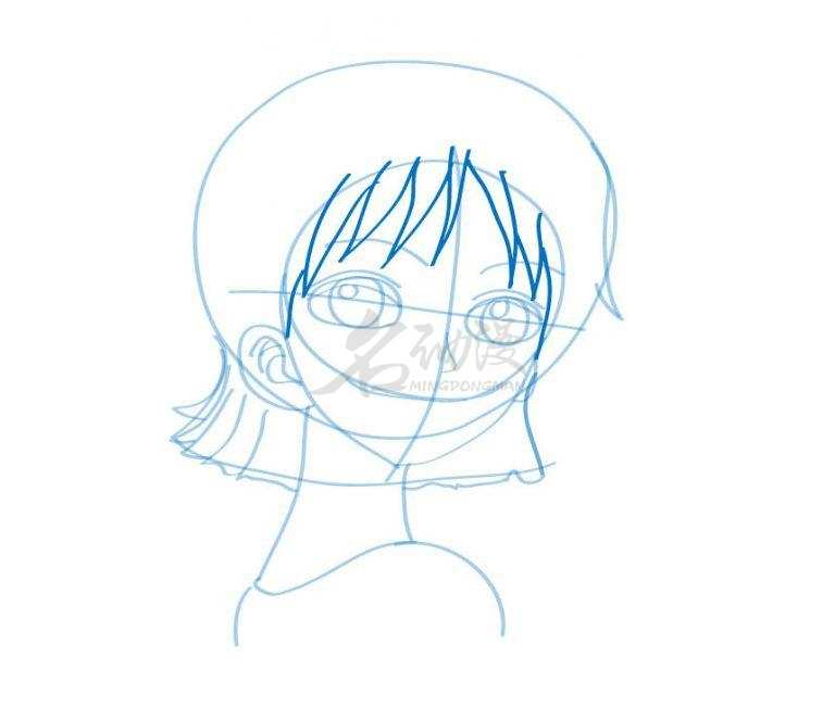 第一步:首先用圆形概括出娜美的头部轮廓,画上十字五官定位线,到画出眼睛的位置以及头发的外轮廓,最后画出脖子和肩膀。这样娜美的外部轮廓就画好了。