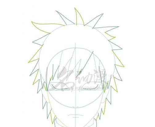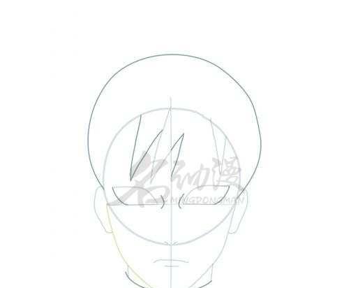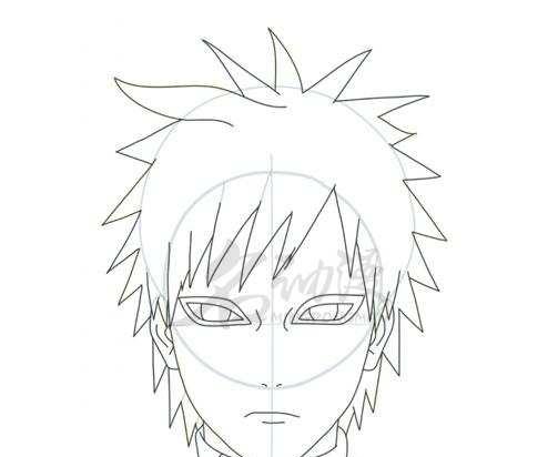 第一步:首先画出我爱罗的头部,然在头顶画出一个比头大的半圆,这里是发顶的位置,然后画出眼眶以及嘴巴和鼻子,再用几根线条概括出刘海的发束,最后画上耳朵,这样我爱罗的头部就有了雏形。