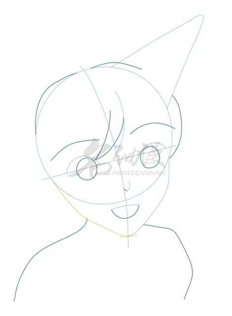 第一步:首先用圆圈画出毛利兰的头部,然后画出肩膀,再画出五官定位线,在五官定位上画出五官,最后画上头发。这样毛利兰的大体雏形就画出来了,我们要在这个基础上逐一增加小细节。