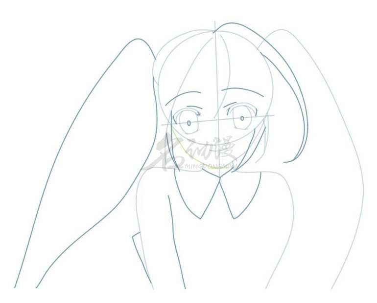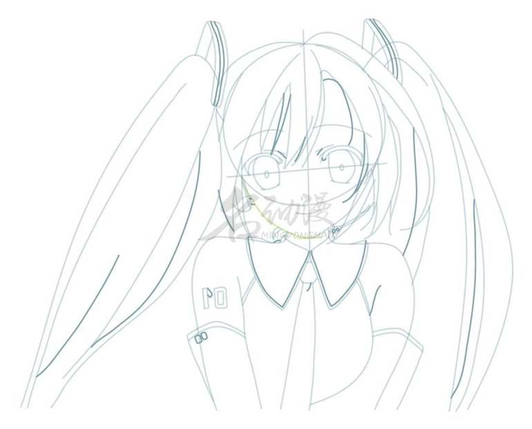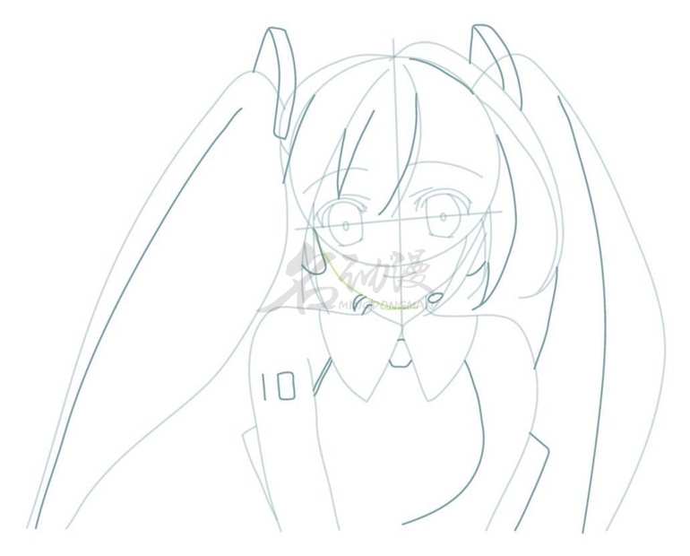 第一步:用线条概括出初音未来的整体外轮扣,比如双马尾、五官等等都要画出来,不用画得特别详细,最后概括出初音未来的衣领,这样初音未来的雏形就画好啦。