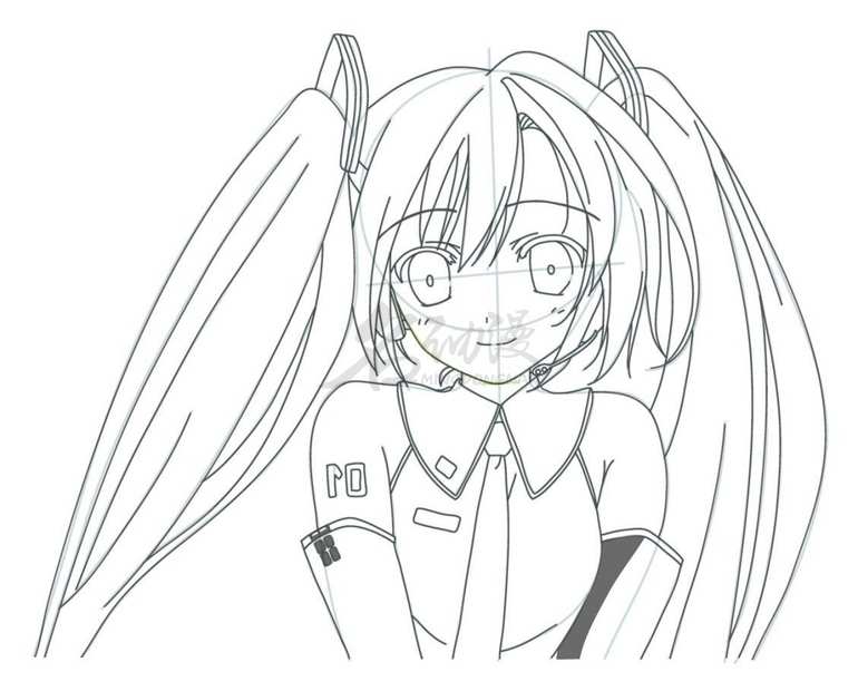 第四步:深入刻画细节,首先塑造头发的层次感,然后把衣服的细节也整理出来画上。这样初音未来的草稿就基本绘制完成啦。