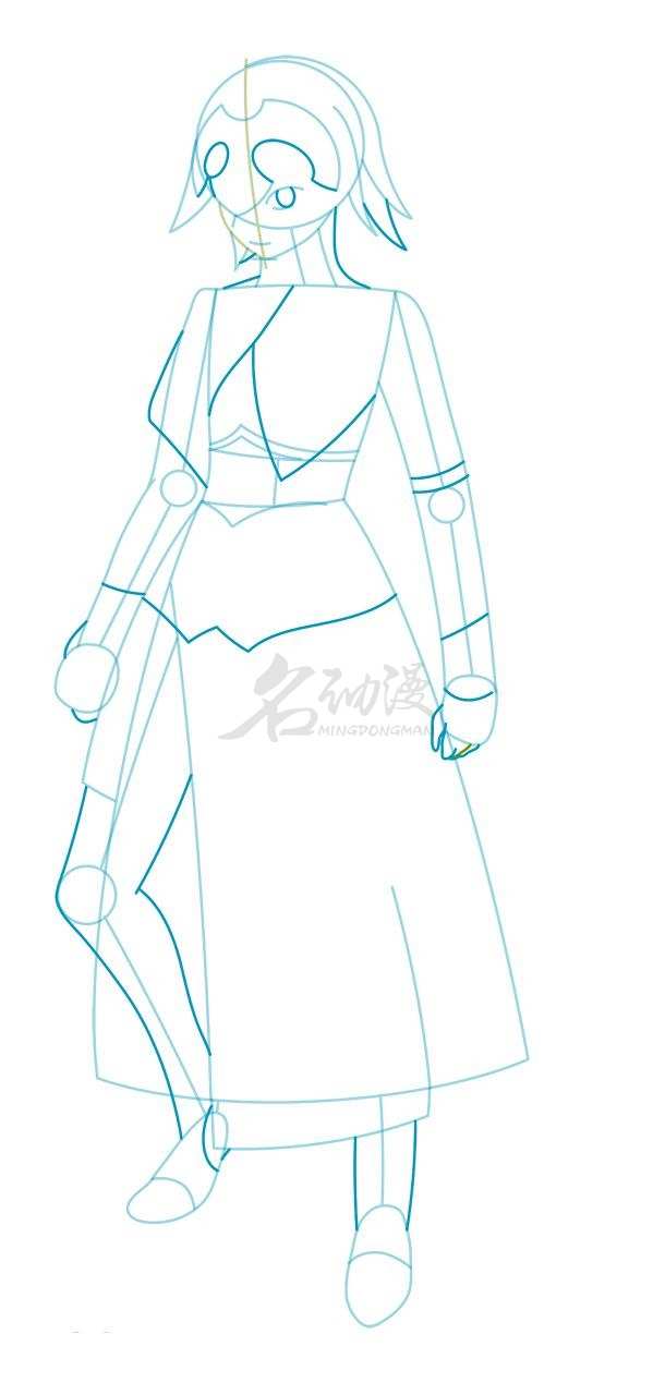 第二步:到这一步,我们要将造型完善。首先将头部铠甲的形状塑造出来,再到头发与脖子部分。头部基本绘制完成之后,我们转向画衣服的造型,并将裙摆的细节刻画出来,比如褶皱、整体造型等等。然后画出手和腿的造型,最后画上眼珠子。