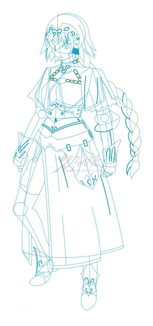 第一步:首先构思好贞德的动态以及整体的造型,再画出裙摆和腰带的雏形,然后画出头部的铠甲和头发,最后勾勒出五官的造型。这样,贞德的雏形就画出来了。