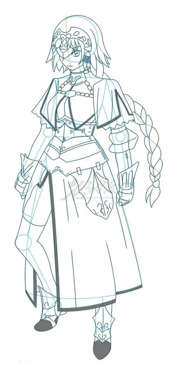 第四步:丰富铠甲与衣服的细节,在裙摆上画出褶皱,最后将马尾辫画出来,这样,贞德的草稿就画好啦。