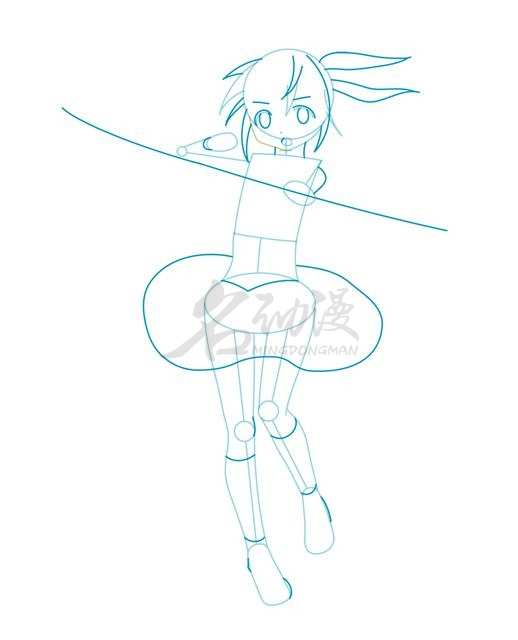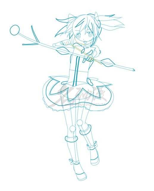 第一步:首先构思好小圆的动态姿势,再画出武器与裙摆的轮廓,到小圆的五官雏形,最后是头发的发丝走向。