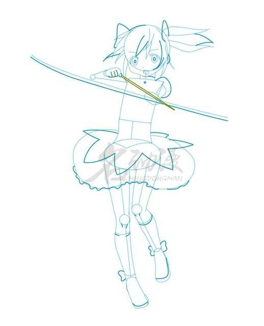 第二步:首先整理头发的发丝走向,给双马尾画上蝴蝶结,到画出小圆的眼珠,紧接着画出小圆的手和武器弓箭,再进行刻画小圆的裙摆和长靴。到这一步,小圆的雏形就诞生了。