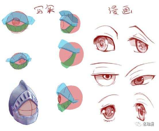 所以根据人脸角度的变化,眼睛的画法也会发生相应的变形和遮挡关系,就像是戴着个头盔的球体,也可以是由上下两块布包着的球;