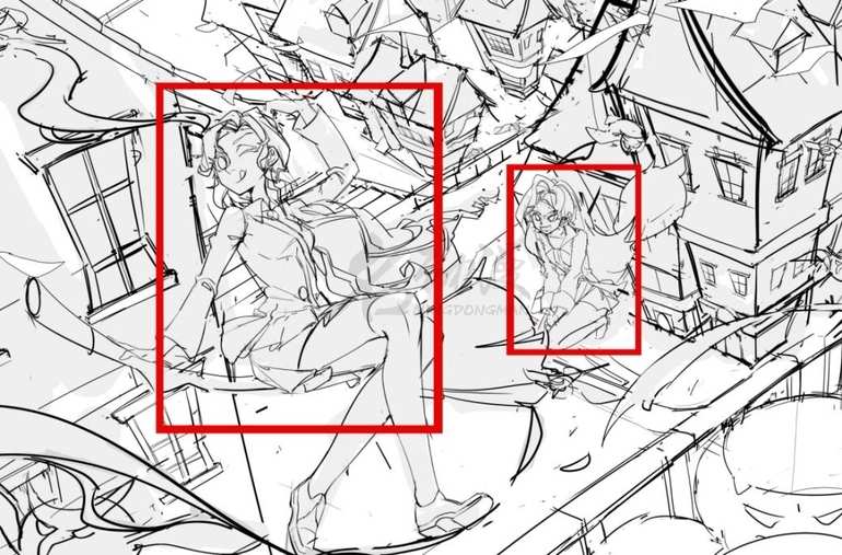 2.运用两分点构图。也可以称为两点对称平衡法,从画面中分割为两个部分,一个主要角色和一个次要角色。如图所示: