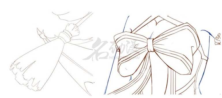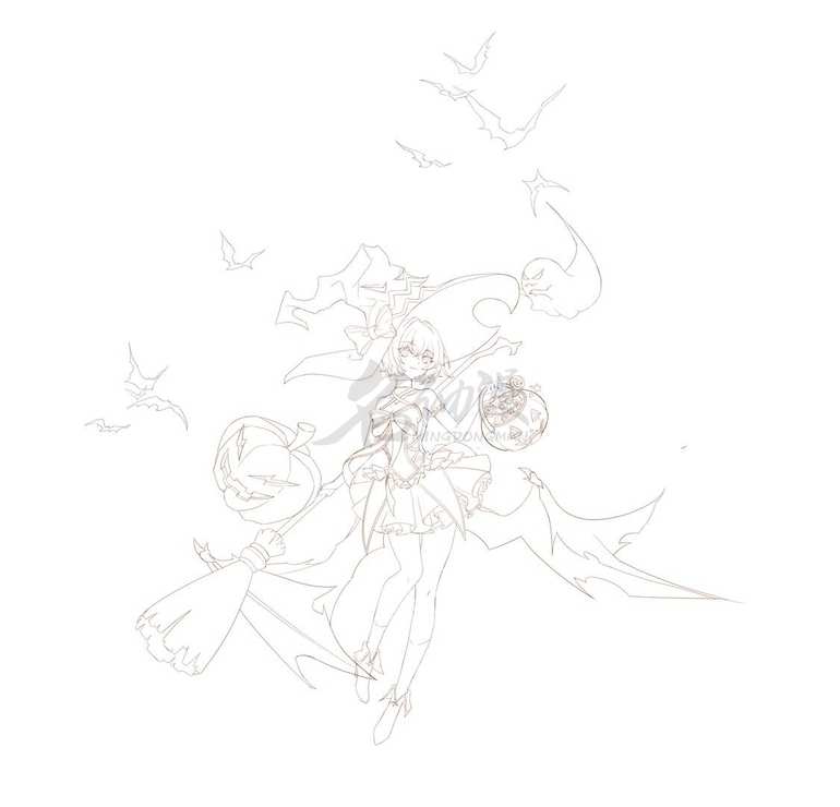 这一步要做的就是把草稿清理出来,并进行草稿优化,修改画面不和谐、不符合常理的地方。如下图:草稿优化后,左右两侧的裙摆根据下半身的动态画成一边高一边低一点点;然后给画面加入“风”,头发和身上能飘起来的东西尽量朝着风向走,最后再补充一些细节,草稿到补充细节这一步算是基本完成了。