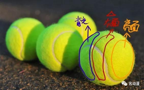 可以看到,网球的暗部位置,由于受天光和其他散射光(偏冷的蓝)的影响,已经呈现出偏冷的蓝绿色,所以不适合作为固有色。