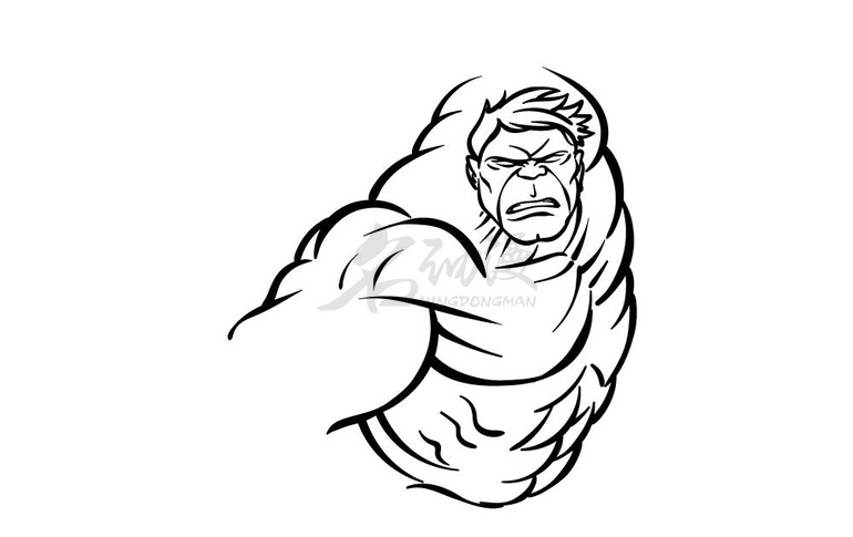 第一步:绿巨人是一个以大部分时间生气而闻名的角色,将以典型的横冲直撞中描绘绿巨人。从绿巨人的脸开始,先用一些曲线画出他的脸颊和下巴的轮廓,然后在侧面画他的耳朵。再将使用一些更有棱角、更尖的线条,让他的头发凌乱地放在头顶。在他脸上使用很多线条来表现他愤怒的表情。在他的肩膀和胸部顶部使用更多曲线来表示绿巨人的肌肉感。如图所示: