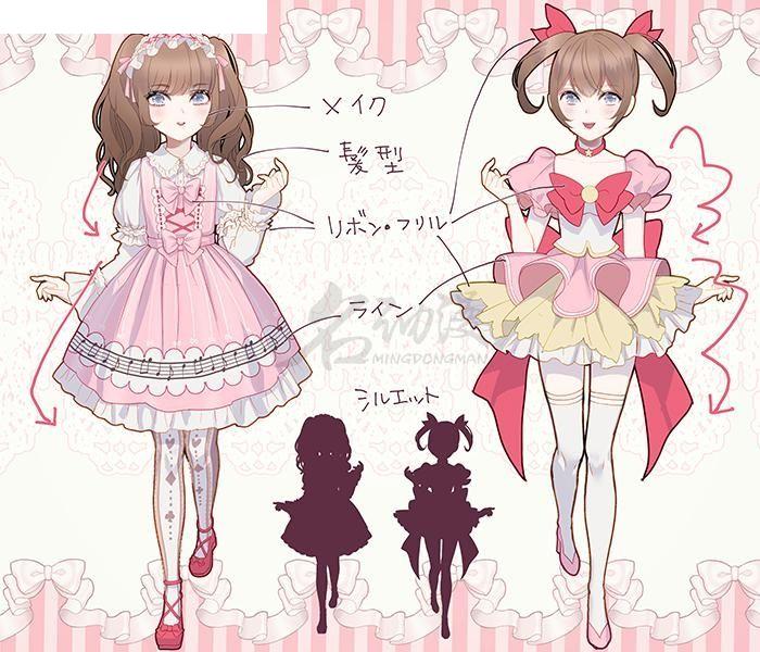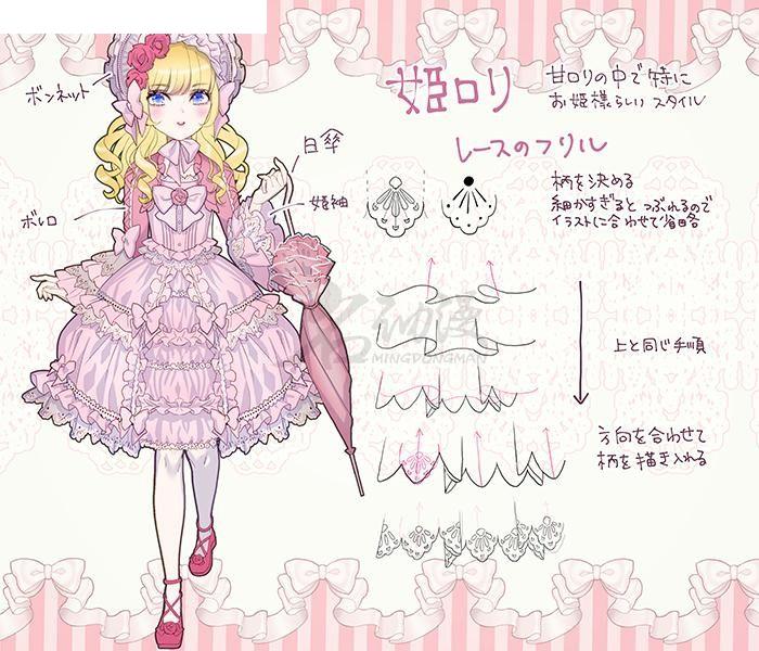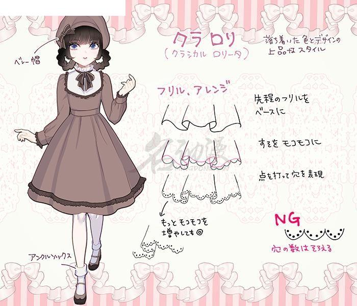 第一步:首先,让我们比较一下真实的洛丽塔与二维角色设计(如魔法女孩和迷你裙女仆服装)的区别。 两者都以相同的主题绘制:双尾,胸前有丝带,泡芙袖子。为了在二维服装中展示其独特性,一般倾向于通过极端表达来增强变形颜色,例如结构不明的巨型丝带或带有点线的褶皱。