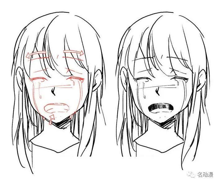 除了“泪流满面”型可以表现哭泣以外,其实我们还需要脸部其他结构的“联动”,让人物的情绪愈加明显。
