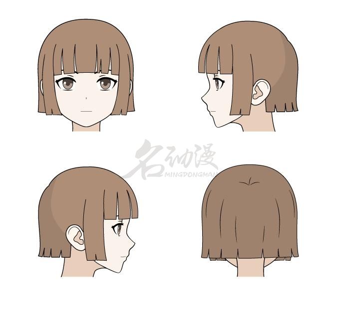 将短发的发际线画成示例的形状,头发末端有小一束。画一些稍微指向黏在一起的团块,看起来有点像湿在一起的头发。