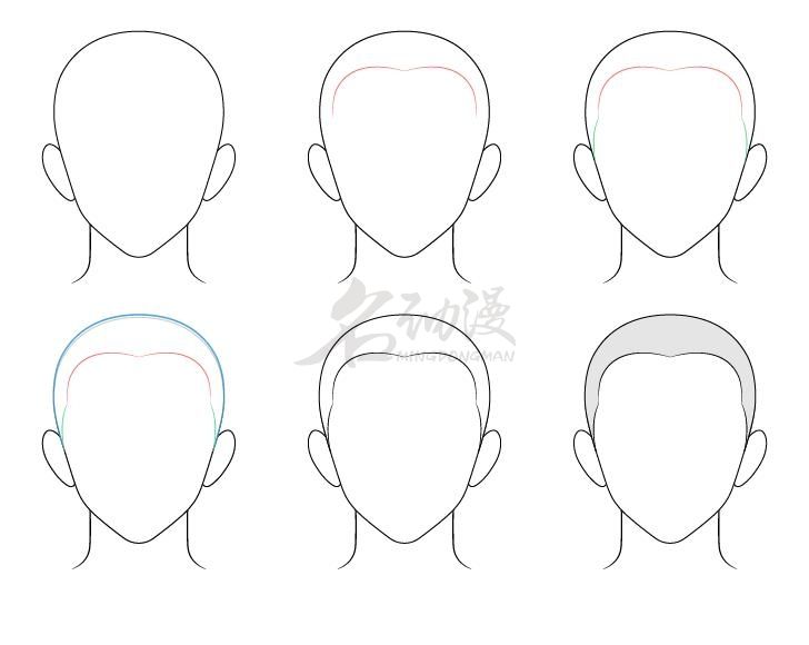 首先在画好的头型上画出前面碎发,且使碎发的底部靠近发际线的位置。接着画上脸颊两侧的鬓角,也靠近发际线位置。在头顶部(后面)周围稍微画出“散开式”的头发。要完成线条,接着被头发覆盖的头部顶部线条擦除掉,然后添加上阴影(灰色)。