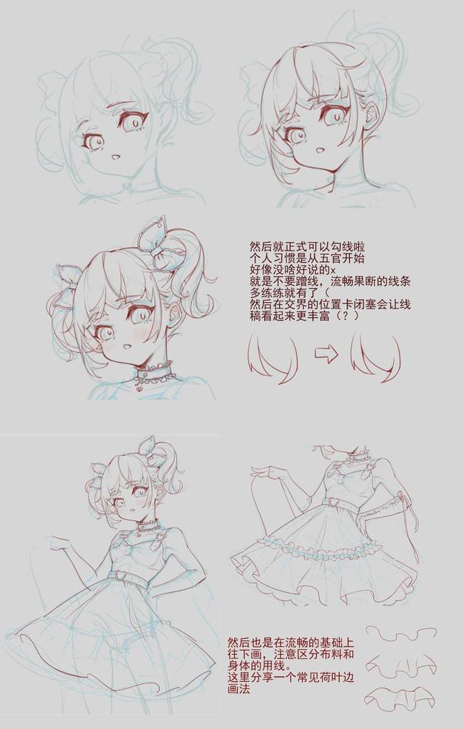 然后也是在流畅的基础上往下画,注意区分布料和身体的用线。这里分享一个常见荷叶边画法叭~