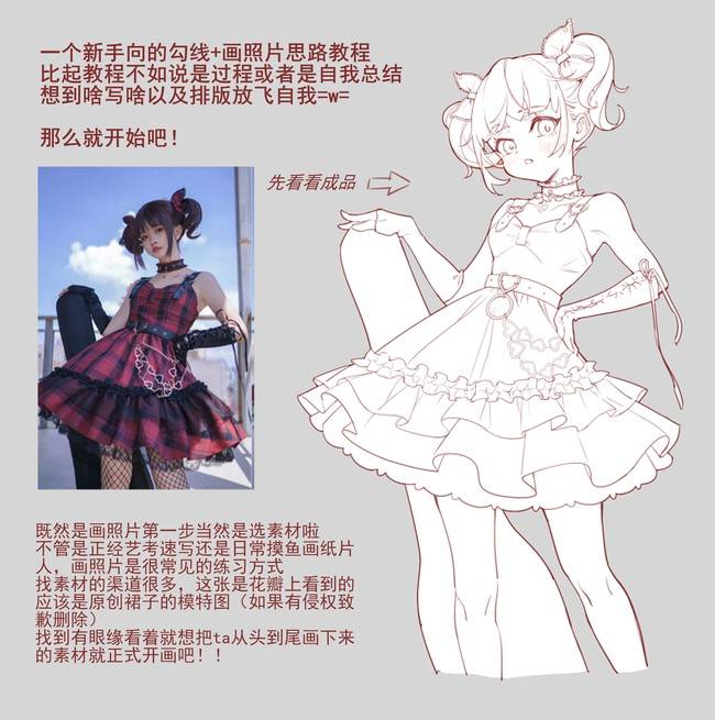 一个新手向怎样画动漫美女的勾线和画照片思路教程,比起教程不如说是过程或者是自我总结。既然是画照片第一步当然是选素材啦不管是正经艺考速写还是日常摸鱼画纸片人,画照片是很常见的练习方式找素材的渠道很多,这张是花瓣上看到的应该是原创裙子的模特图(如果有侵权致歉删除)找到有眼缘看着就想把 ta 从头到尾画下来的素材就正式开画吧! !