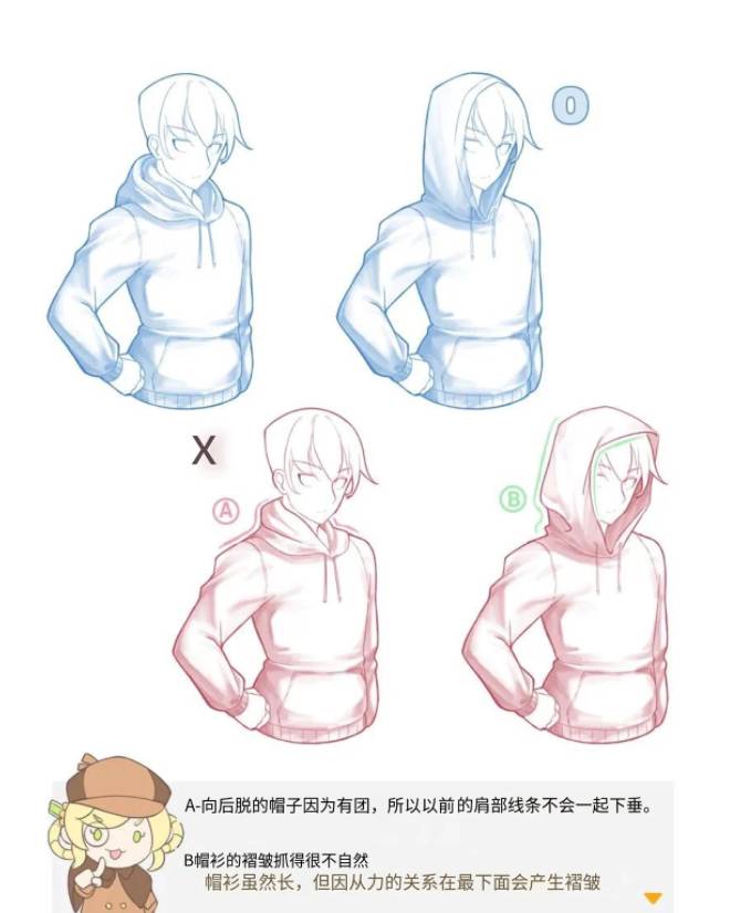 后面的部分也必须向上拉,因为帽衫会被B头拉到。