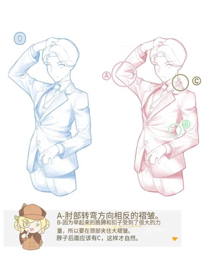 B-因为举起来的胳膊和扣子受到了很大的力量,所以要在颈部夹住大褶皱。