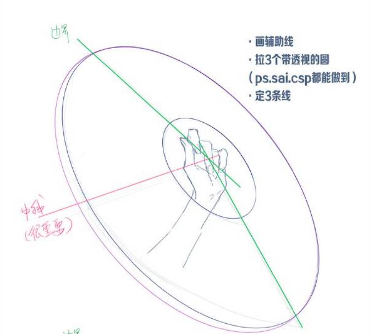 2、画辅助线,然后画出三个带透视的圆形。定三条线。