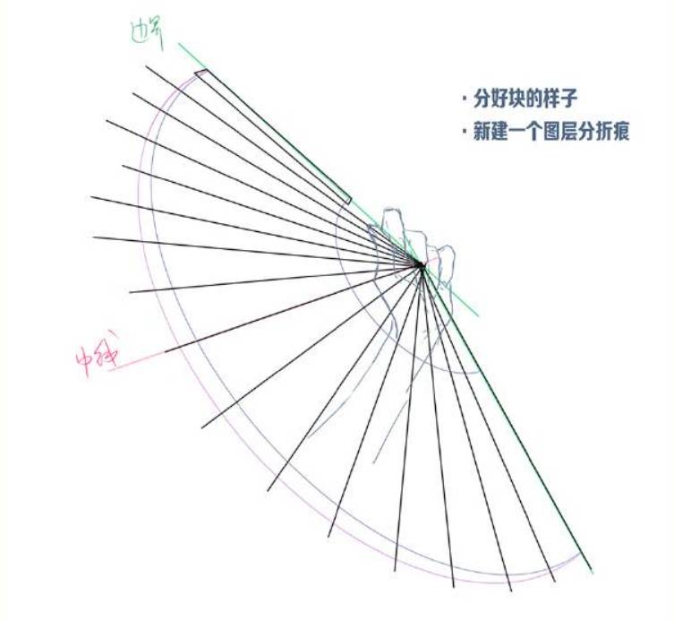 4、注意透视的前提下去分扇面。先一分二,再二分四,以此类推。