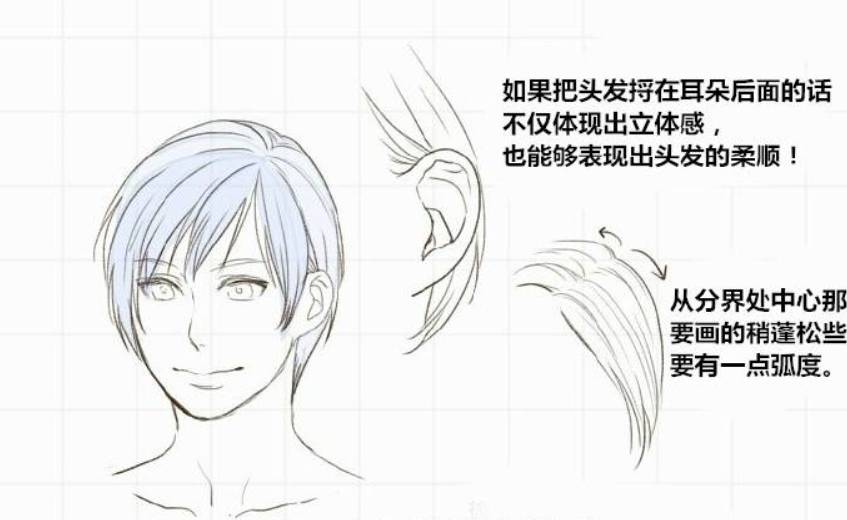 画了后脑勺部分的头发。虽然说有分界处,但并不一定非得从分界处那里拉线条出来。我倒是觉得只要有意识到:“这里是头发的分界处”会比较好。