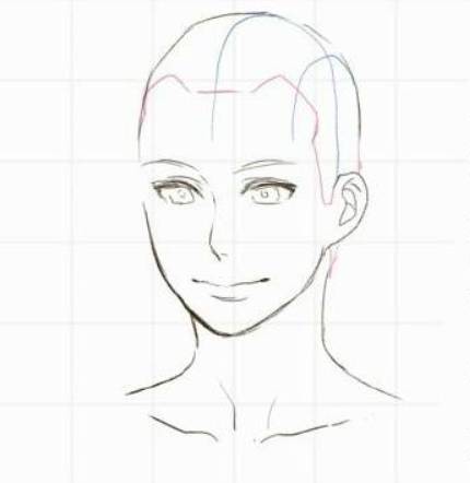 首先先打出头部轮廓。眼晴大致是在头的正中间。由于年龄向下的话位置也会发生变化,请自行根据面部的平衡进行临机应变。耳朵的位置,即使是不戴眼镜的角色,也要设想出TA戴着眼镜的模样,从外眼角向外拉条横线。红线是发际线。蓝线是头部的立体示意线。将眉毛终点与这个位置相重合的话,看上去就会很有平衡感。眼部边缘轮廓不能超出眉毛。