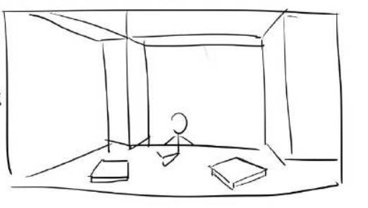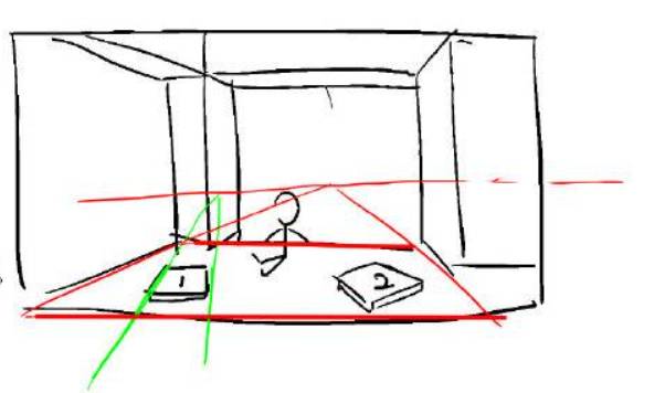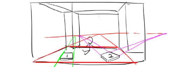 假设房间地面和水平线是平行的,那可以根据另外两条线确定地面的消失点在哪里,根据这个消失点再画一条水平线,就可以得到地面的水平线了,所有放在地面上的人和物,有一个面的消尖点肯定在这同一个水平线上。
