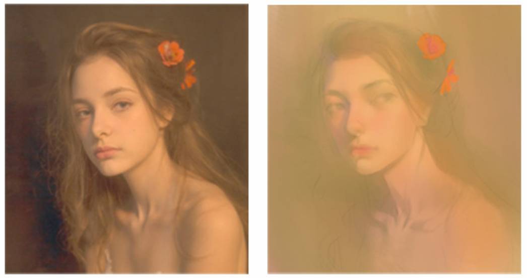 左边是原参照图,这照片中的灰调子面积很大且几乎没有高亮区域所以大致将画面分成三个色调即:亮灰调,中灰调和黑调。然后根据简化过的色调再简化一下每个色调的基色,这样整个画面里就大概被分成了,最亮的黄色调,稍暗的绿色调和最黑的红色调。这就是整张画的素描大关系和色彩大关系。