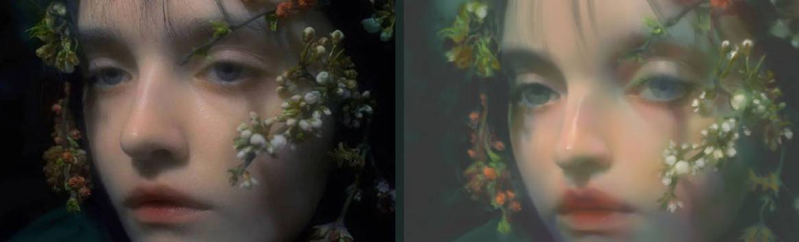 所谓颜色的主观的感受,很多时候就是我们刻意放大了某些颜色在整个画面中的权重,就比如这张图中,因为我偏爱青绿色调,所以我看到的画面中的调子更接近左图的状态。这一步主要目的是建立起来整个画面的冷暖关系,我把所有光照不到的地方都用青绿色刷了一遍。因为原本底色是暖色的,所以自然就呈现出有趣的颜色对比出来。