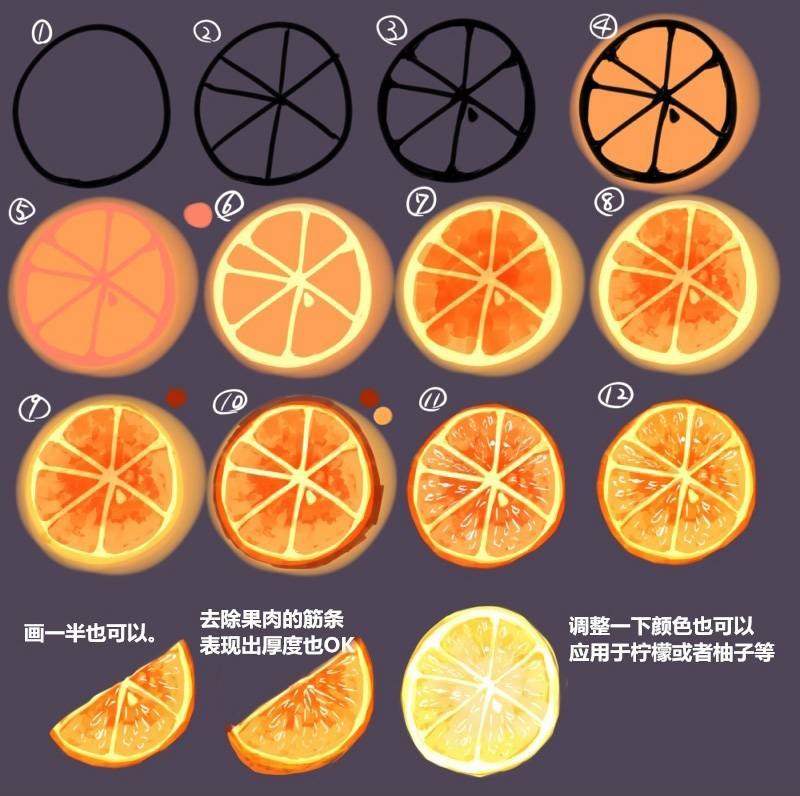 画个橙子,一个直接按照图中步骤绘画即可。当然,你也可以画一半也可以,去除果肉的筋条表现出厚度。调整一下颜色,也可以应用于柠檬或者柚子等哦。