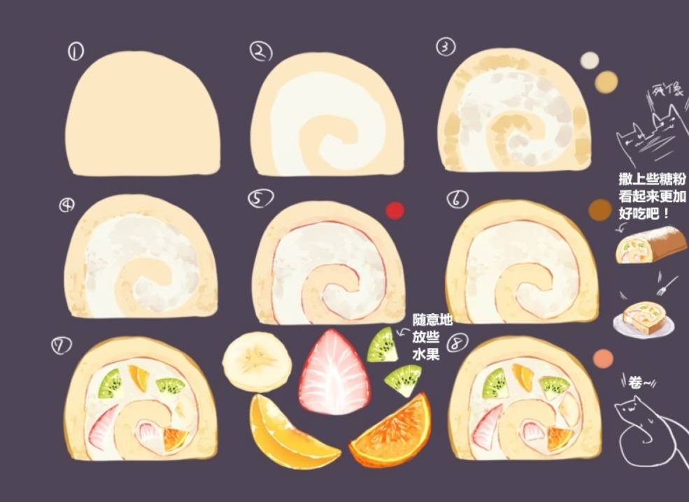 这图中展示的是绘画美味的蛋卷步骤哦,大家参考步骤进行绘画即可。可以添加一些糖粉,看起来更好吃哦!