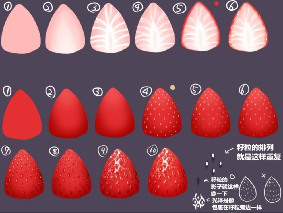 画个草莓,籽粒的排列就是这样重复。籽粒的影子就这样唰一下,光泽是像包裹在籽粒旁边一样。