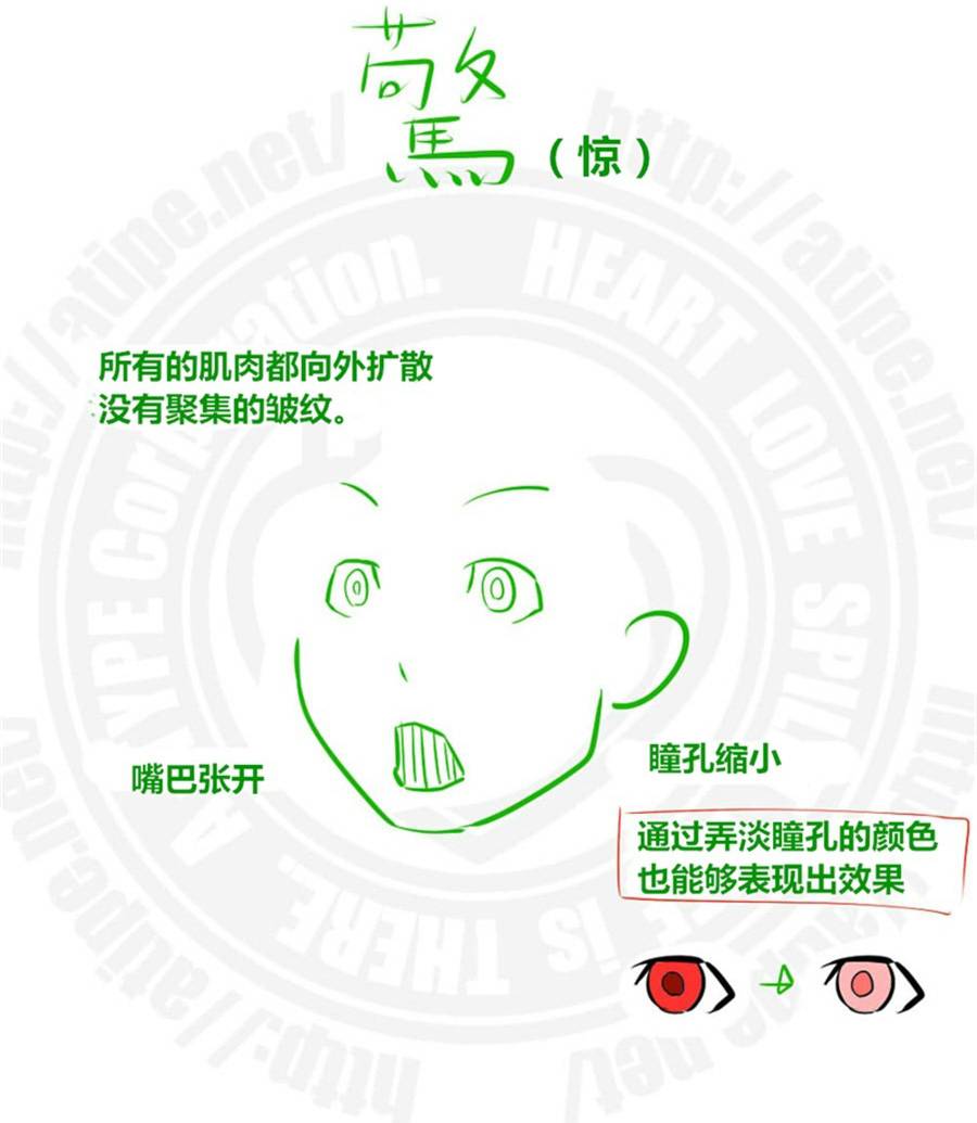 如果非常生气的话,在眼睛的周围,眉间的大范围中形成褶皱的话看起来会更加生气。越是生气(紧张),瞳孔越是缩小。生气时,虽然在嘴部周围会形成“法令线”。但是看上去不太好,所以就省略不画了。
