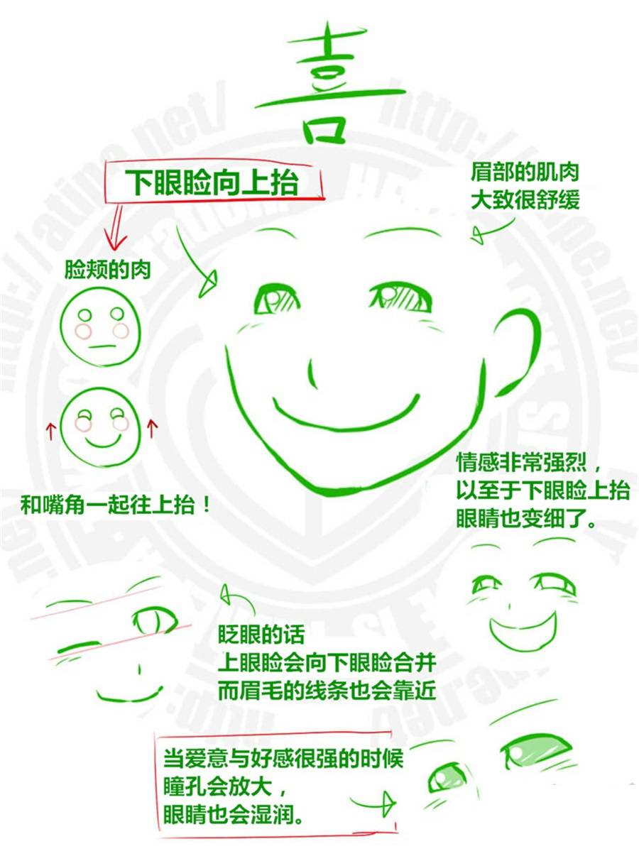 当人物开心的时候,人物的脸部的下眼脸向上抬,眉部的肌肉大致很舒缓。脸颊的肉和嘴角一起往上抬!