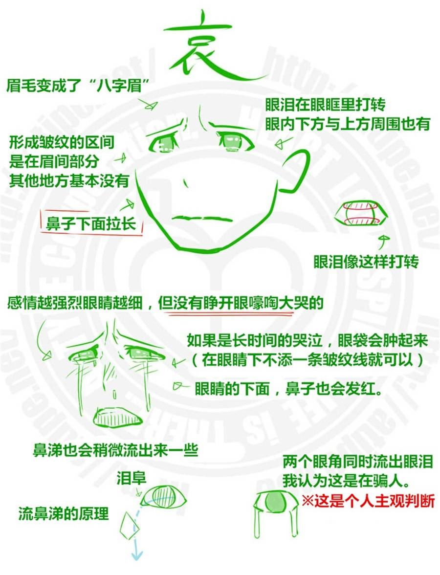 感情越强烈眼晴越细,但没有睁开眼嚎陶大哭的。如果是长时间的哭泣,眼袋会肿起来,在眼晴下不添一条皱纹线就可以。而且眼睛的下面,鼻子也会发红。鼻涕也会稍微流出来一些。
