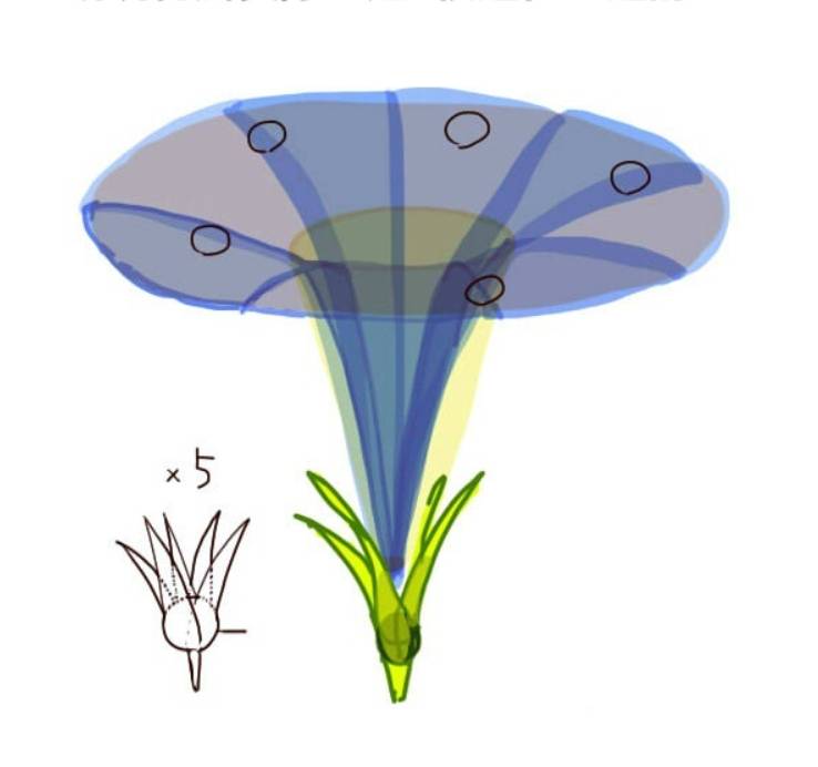 这一步大家要画添上花萼。牵牛花的花瓣实际上是5枚连在一起的。所以我认为做记号的时候也是5个或7个比较好。底部的花萼重叠着(就是那个绿色的东西哦),而且很长。最后就画完啦,大家之后要多多练习哦。