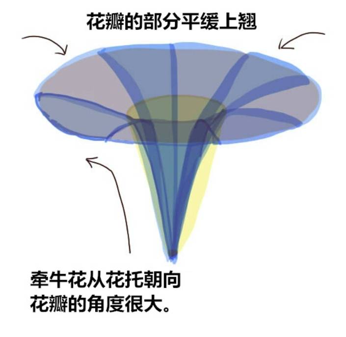 这一步大家用适当的角度进行绘画分割,来决定花瓣的角度。也许分割成7~8个部分会更加容易进行操作。大家还要记住花瓣的部分平缓上翘,牵牛花从花托朝向,花瓣的角度很大。