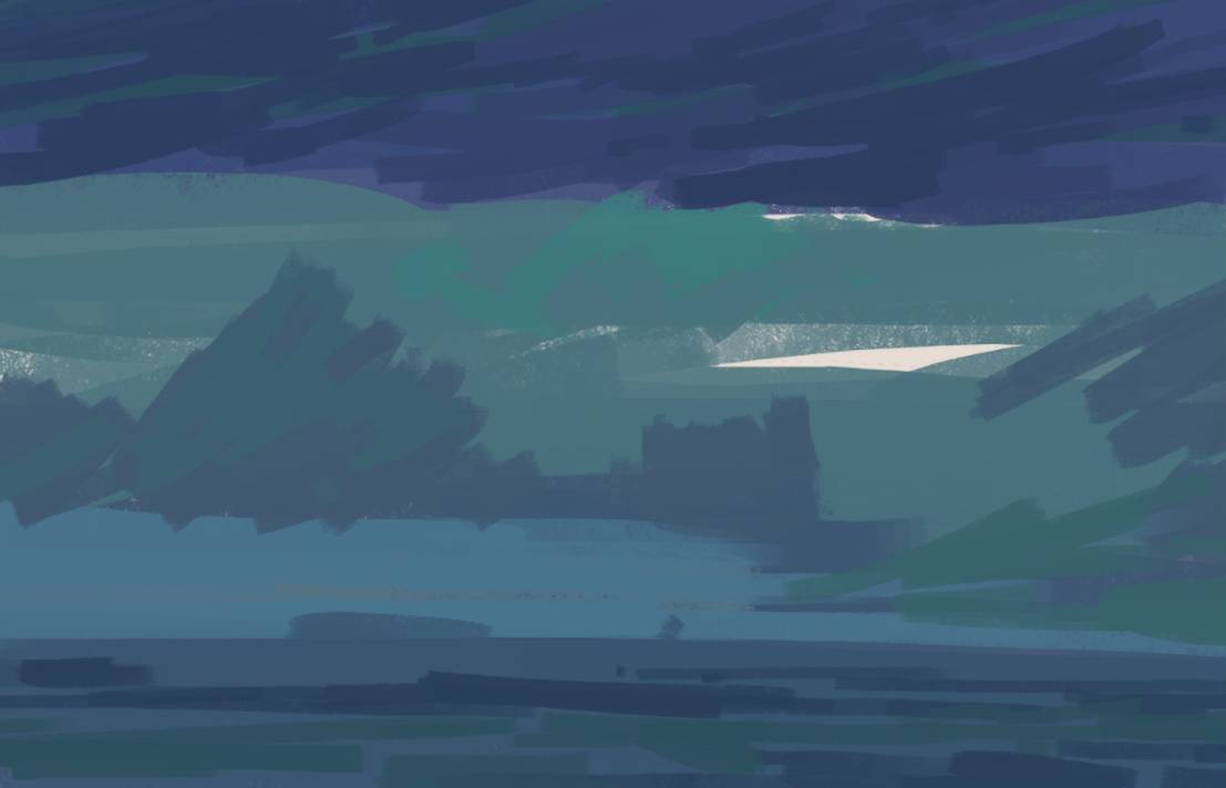适当绘画加入前景水面细节和浪起伏面的渔网状水花细节,注意疏密/虚实控制。