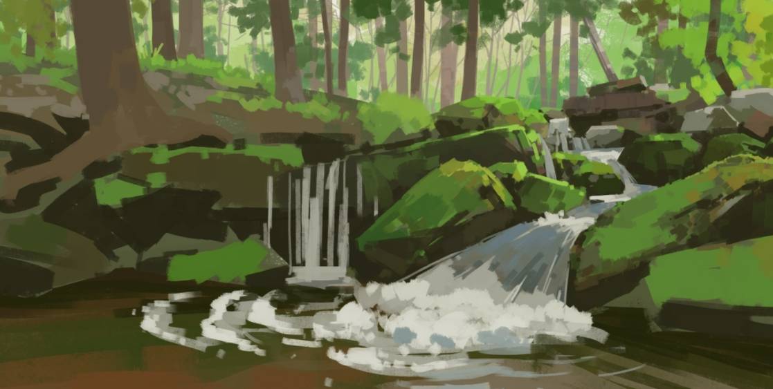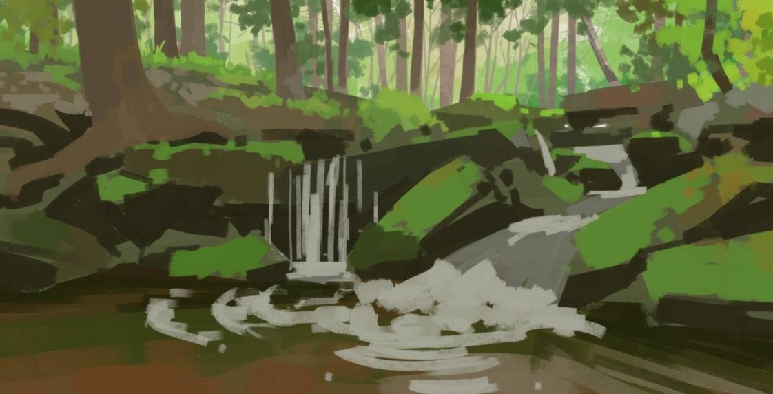 画出溪流的位置。通过增加青苔,让石头的部分变得丰富起来。注意青苔面积大小的控制和形状变化,不能太过整块,得有正负形的穿插关系。