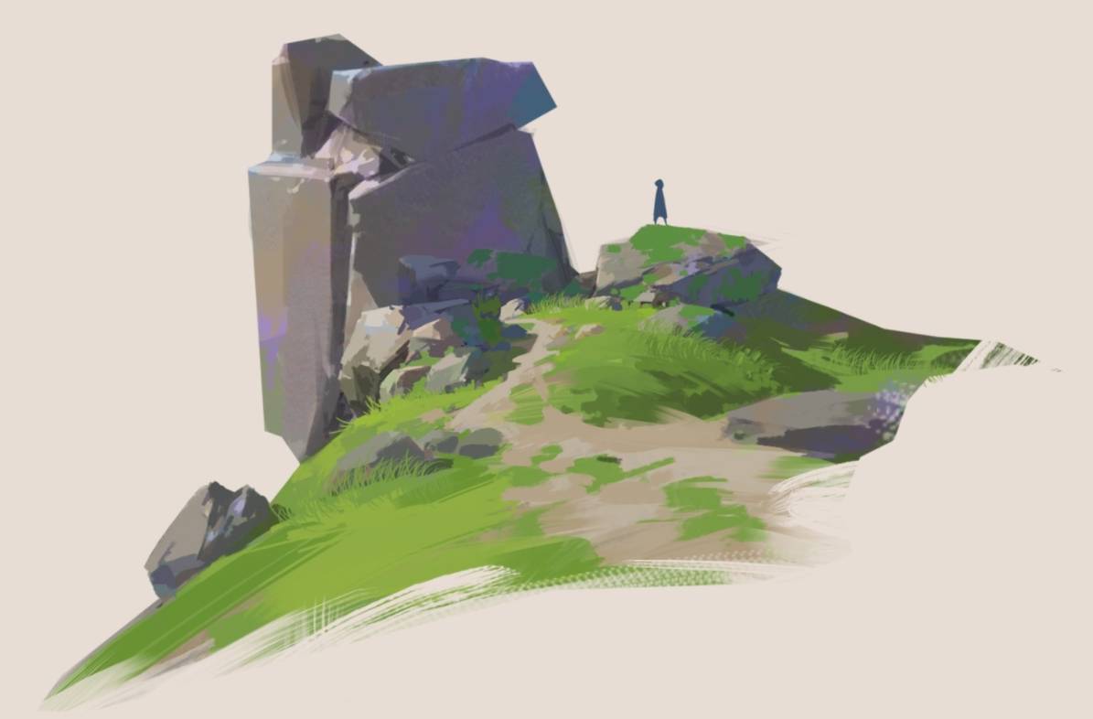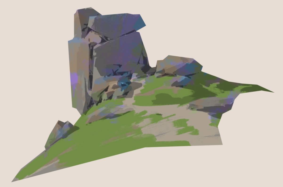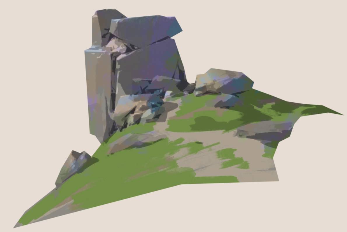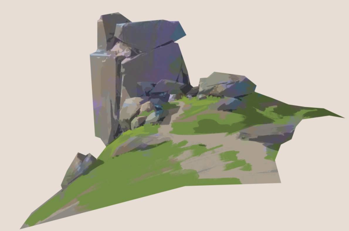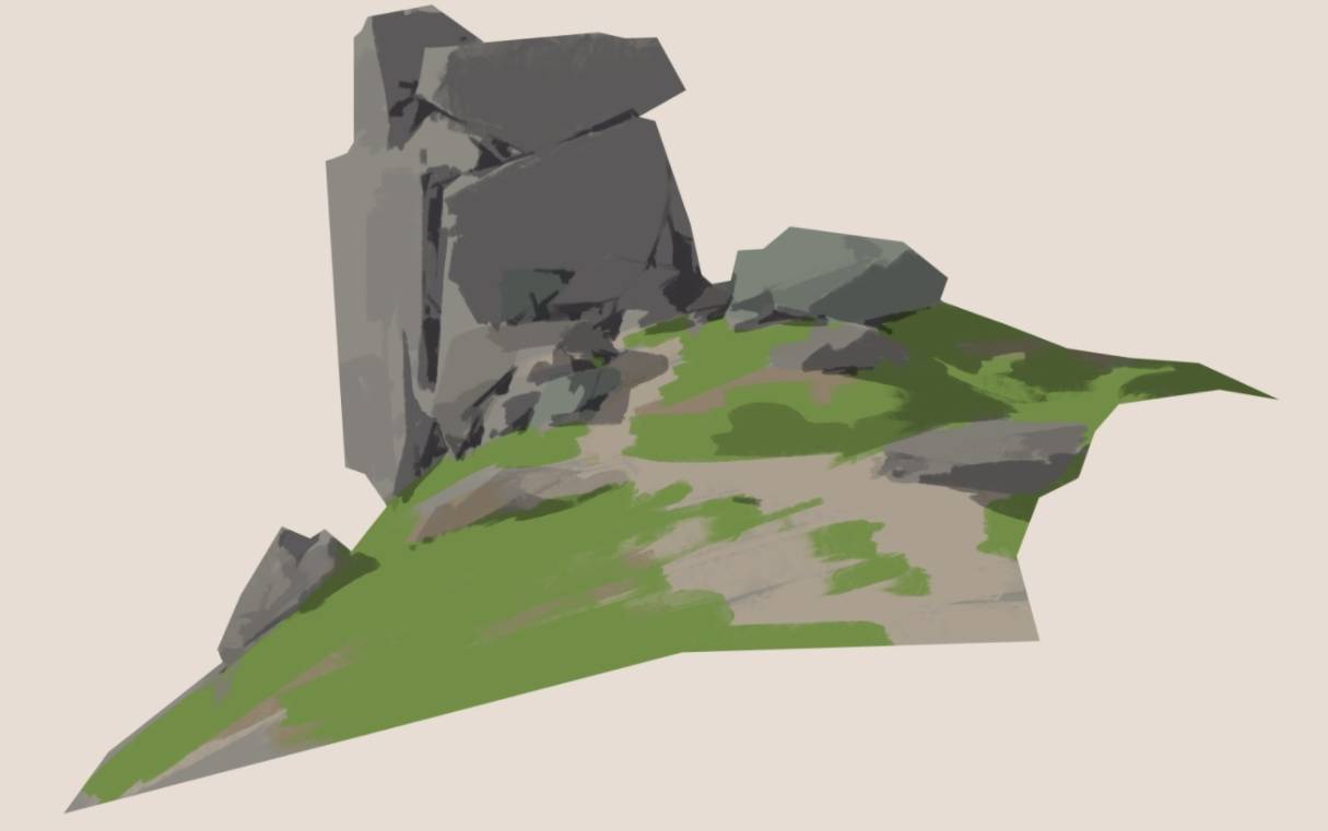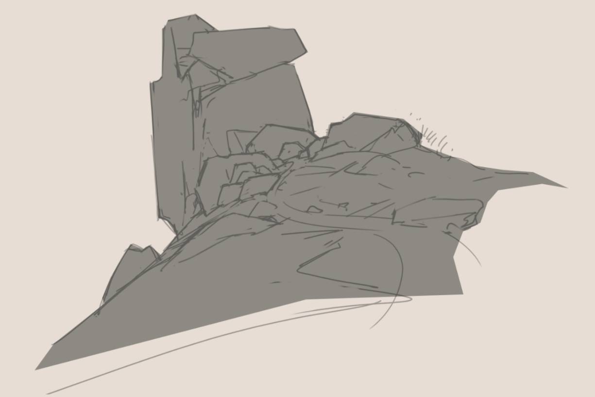 先绘画定好一个大块石头的主体,强调出它的亮灰暗三个面。从而就可以确定它的体积(这个角度明显的只能看到两个面的体积)。注意切割点的位置,一般尽可能黄金切,这样可以尽量避免石头没有整体感。