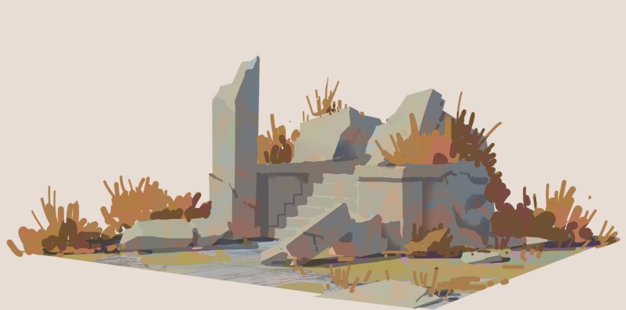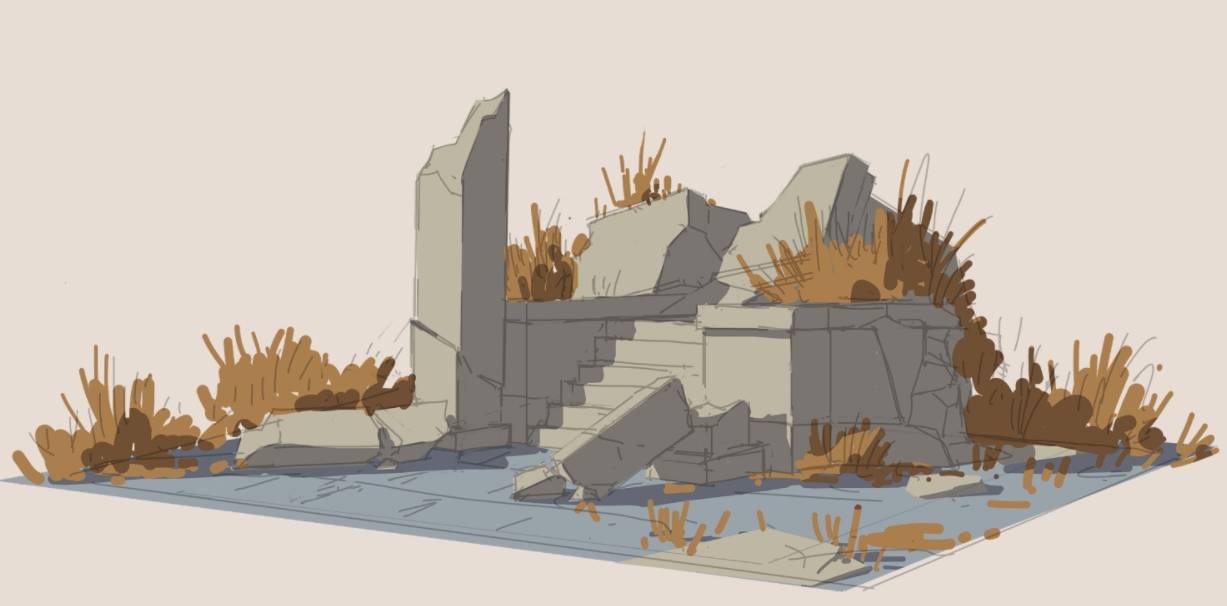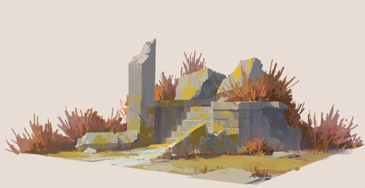 通常我画废墟的时候,我都是先完整画出全部的石头,再去切割出变化来。切割的时候,要注意黄金比的断裂位置,硬线条和软线条的结合。