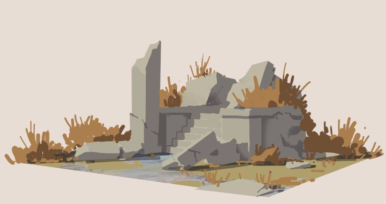 绘画塑造废墟周围草的体积。注意先表现体块,再适度增加草叶子细节,重点是体积不乱。