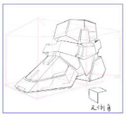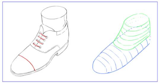 看下图鞋带和鞋头皮革的透视是反向的,那么如何确定相对复杂物体中的小透视呢?我们可以把这些复杂的物体进行拆解,在标注上相应的透视线,就可以得到局部地区的透视线啦!