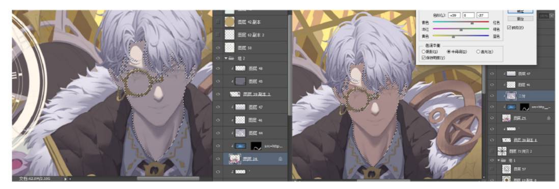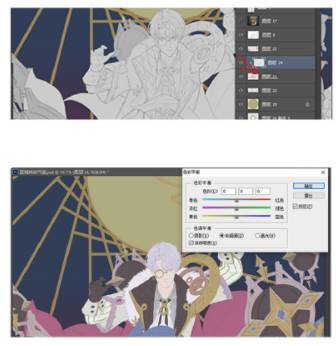 注意:填完固有色后,我们再用色彩平衡调整一遍色彩倾向,简而言之冷色调整体往冷色偏,暖色调整体往暖色调偏。如果不想有明显的冷暖偏向,就不用调整啦。