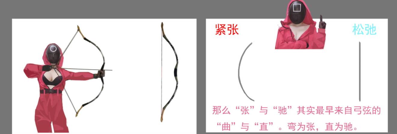 所以,我们的练习一定还是要把“结构张力”,当作非常重要的任务去练习。当然首先你要感觉得到“张力”,那么什么是“结构张力”。“张力”这词中的“张”取自“张弛”一词,而张驰又来自于弓箭的弦的状态。