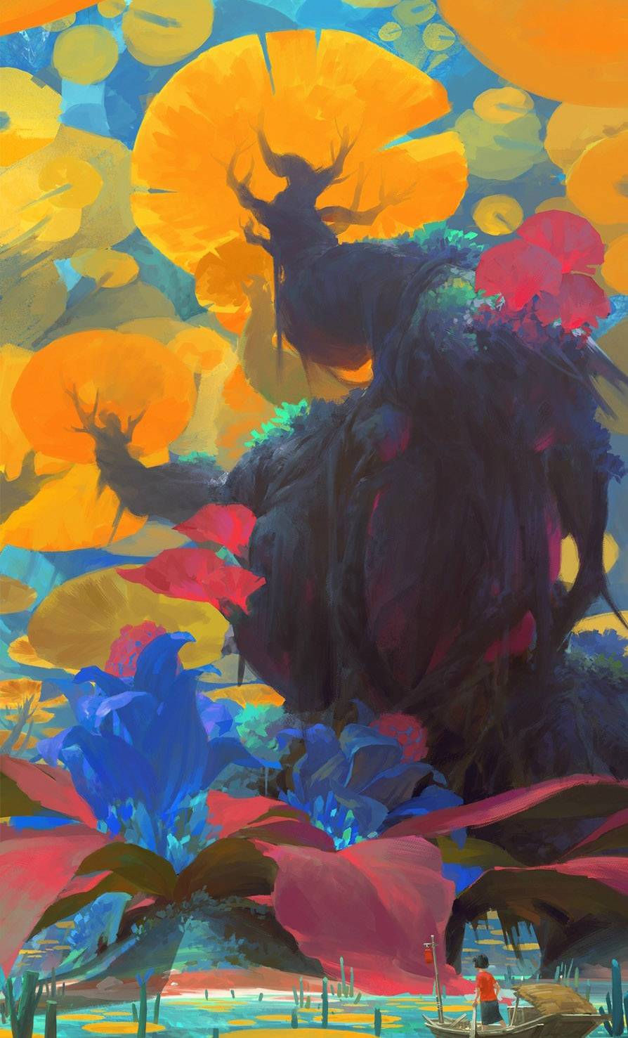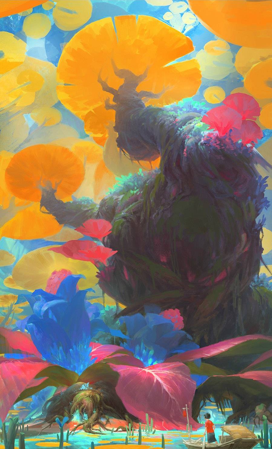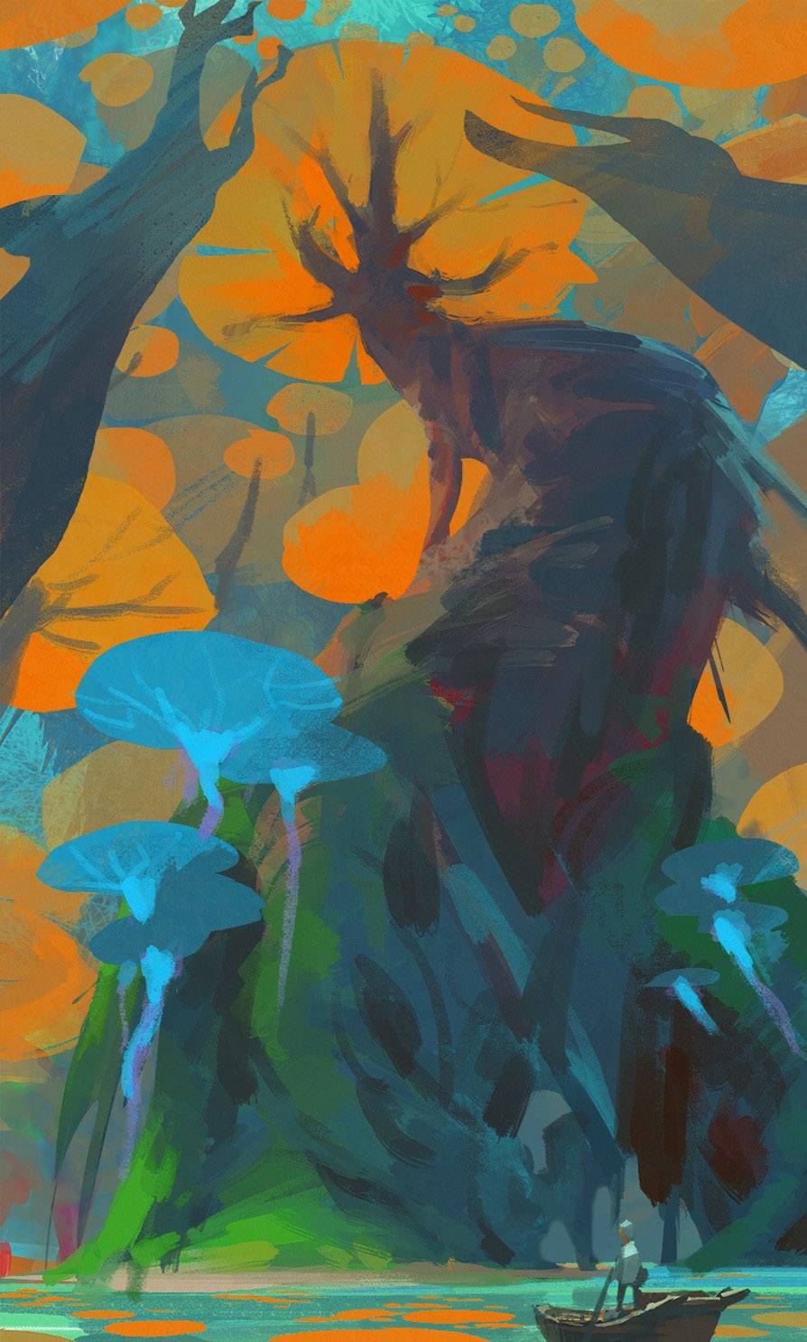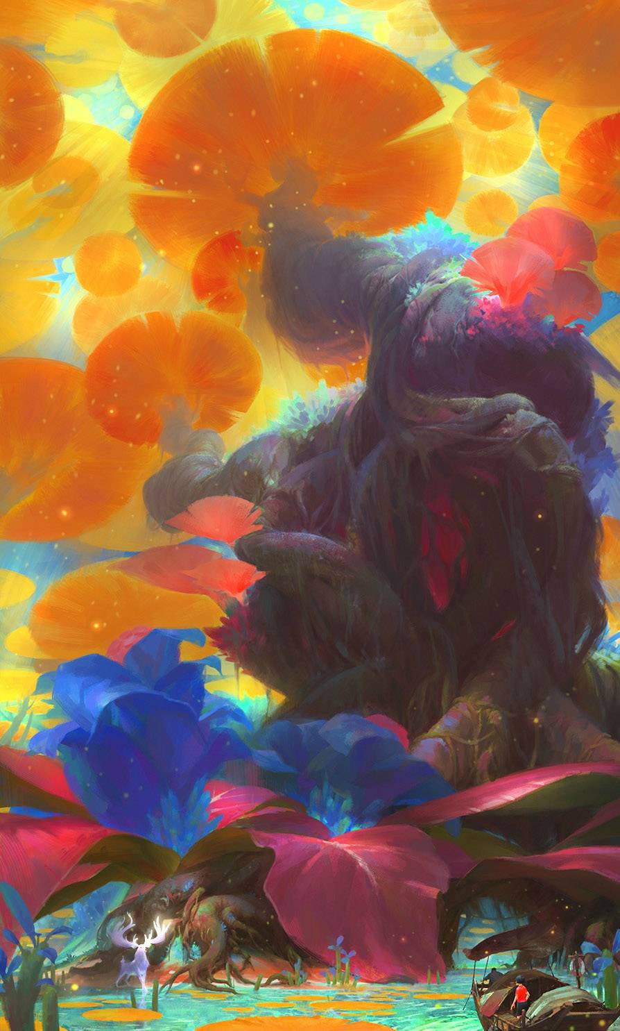 继续细化场景的构图。加入一些奇幻的环境元素,比如萤火虫,就特别充满奇幻感,但又是现实中能见到的东西。画到这里我就会想起小时候傍晚在田埂边嬉戏的画面。童年的美好回忆!感觉这辈子也许很难再体会了。接下来进步深入刻画光线和质感以及添加细节。