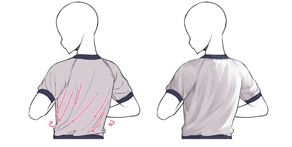 手臂产生的衣褶会朝向腋下,由于衣物是紧身的,所以会产生左右拉紧的衣服褶皱。