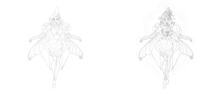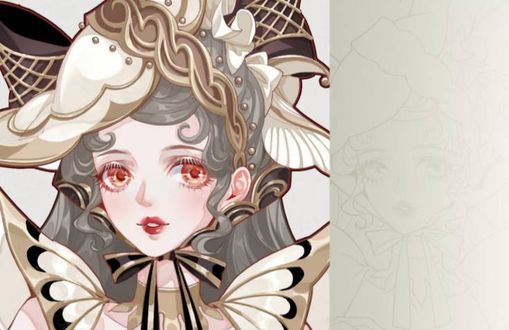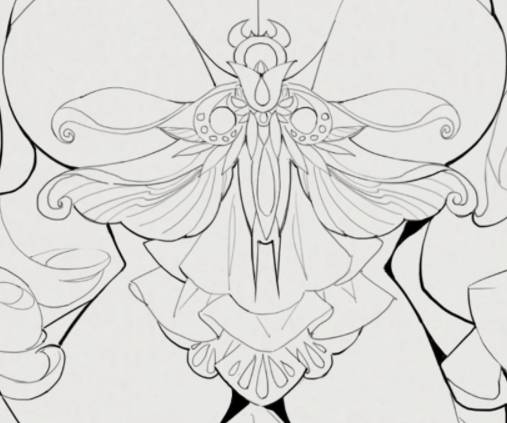 线稿我主要对头部的帽子和胸口的装饰物进行了丰富和细化,装饰物简单一些就是采用虫虫本体的轮廓,但是考虑到整体的风格方向,不能让虫虫细节过于具象,搭配金属和宝石,朝胸针、发卡之类的饰品方向设计会更搭调。