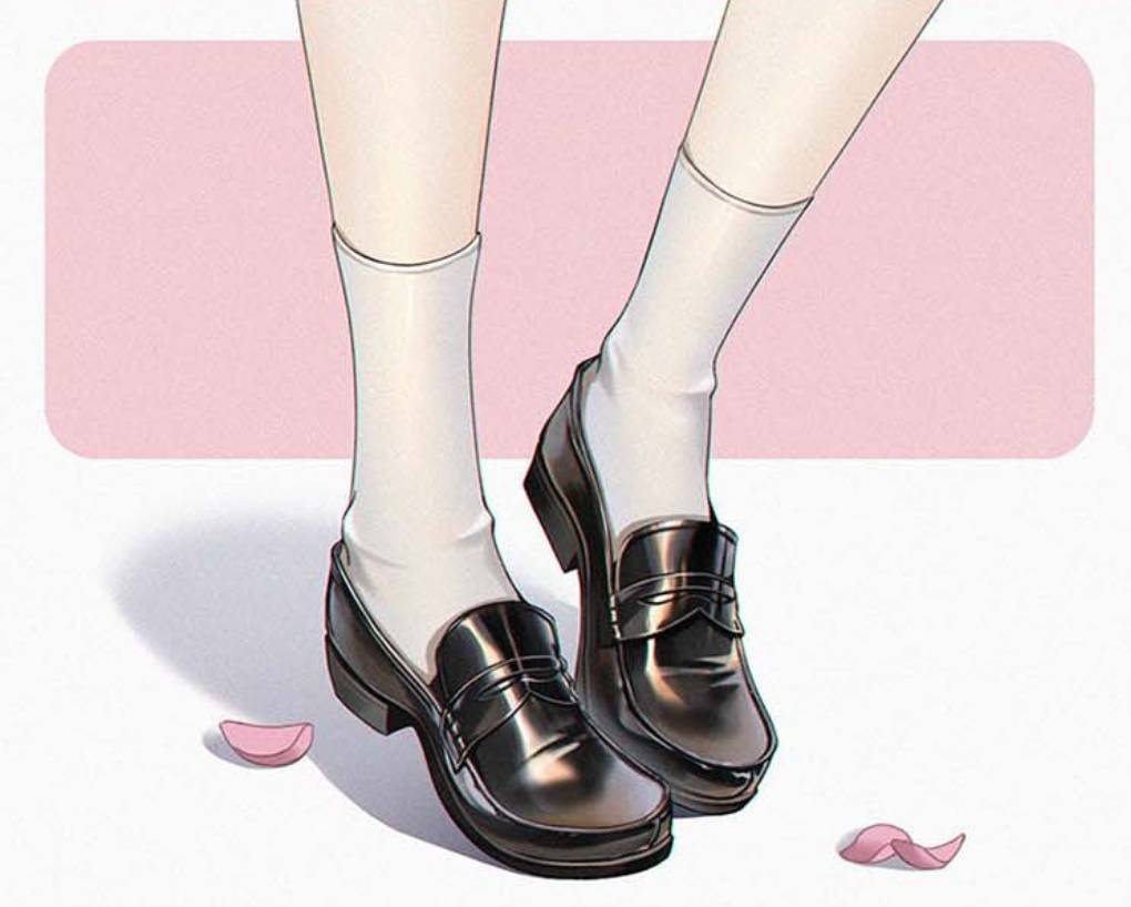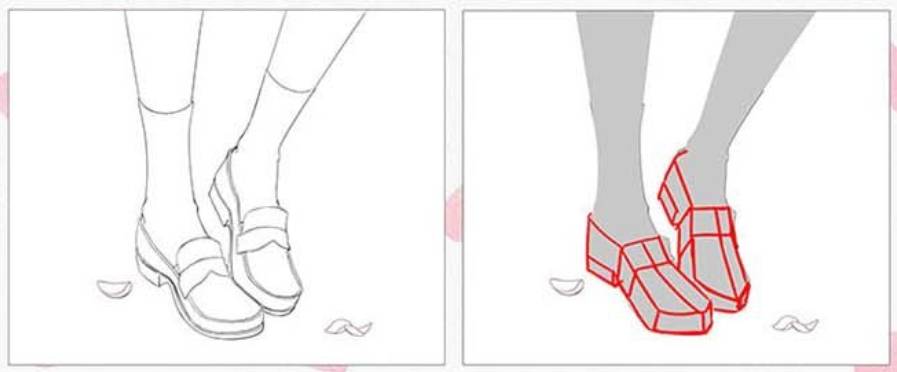 选择了一个在画立绘时最普遍的四分之三侧的角度,把线稿勾勒出来。在画线稿的过程中,可以先将脚的型勾勒出来,然后再穿鞋,这样就会避免鞋没有穿在脚上的问题。这一步注意在画的过程中可以先从剪影和基础几何形出发,从大的型去做,再根据参考图把鞋的裁剪和设计补全。